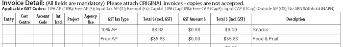 In completing the Accounts Payable Invoice Cover Sheet, the GST Codes to be entered in the GST Tax Type will be Free AP and 10% AP. The entries will be on separate lines as per below.