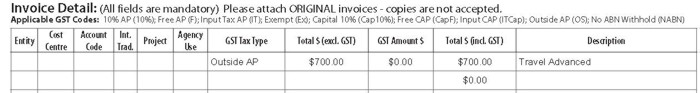 In this instance an advance is made to a staff member who is to undertake international travel. The Accounts Payable Invoice Cover Sheet GST Tax Type Code to use is Outside AP.